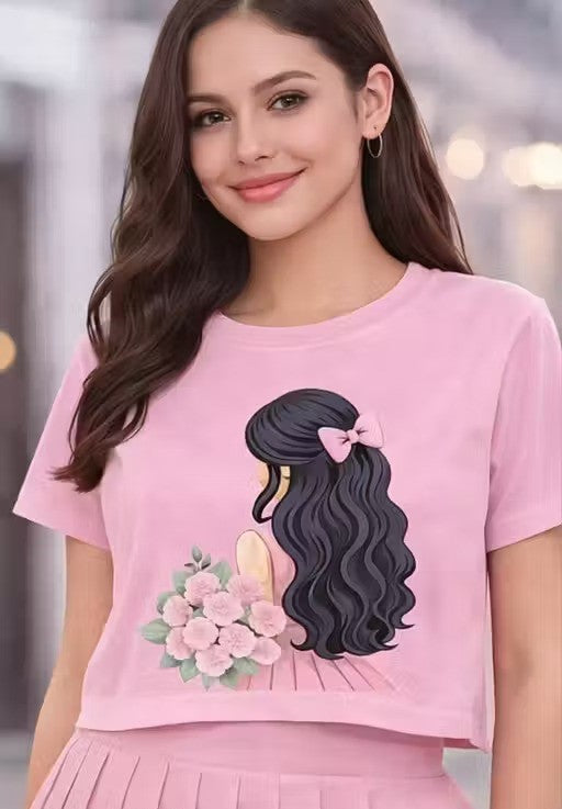 This soft pink crop t-shirt brings a delicate and feminine charm with its elegant graphic design. Featuring a beautiful illustration of a girl with flowing hair tied in a bow and holding a bouquet of roses, it adds a graceful, aesthetic touch to your look.